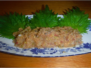 【3】 お皿に大葉を敷き、叩いたアジを盛り付ける。