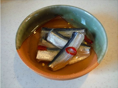【5】 サッパを三杯酢と刻んだ鷹の爪と一緒に漬け込む。