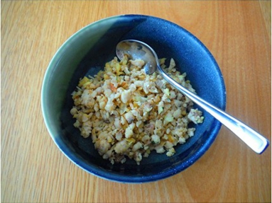 【2】 さんが焼きは、ハンバーグ状にし焼きますが、さんがらはフライパンで炒ります。